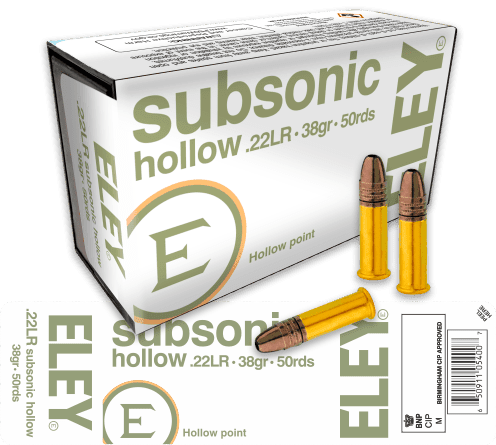 ELEY subsonic hollow is a hunting cartridge with target shooting accuracy and reduced velocity, offering a quieter muzzle report compared to other .22LR hunting rounds.